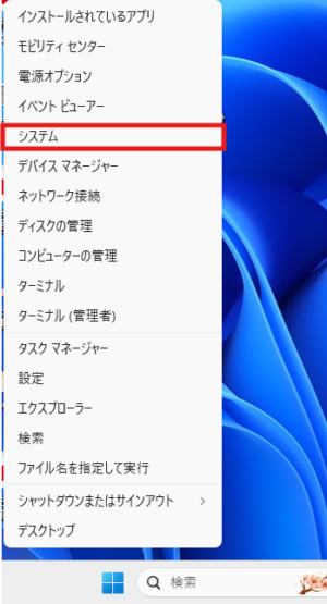 1. パソコンで[スタート(Windowsアイコン)]の上で右クリックし、[システム]を選択します。